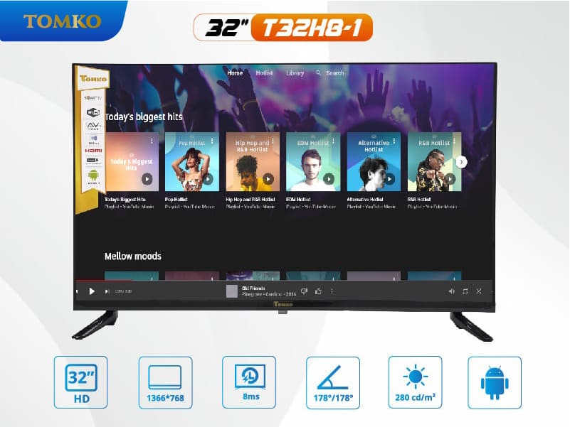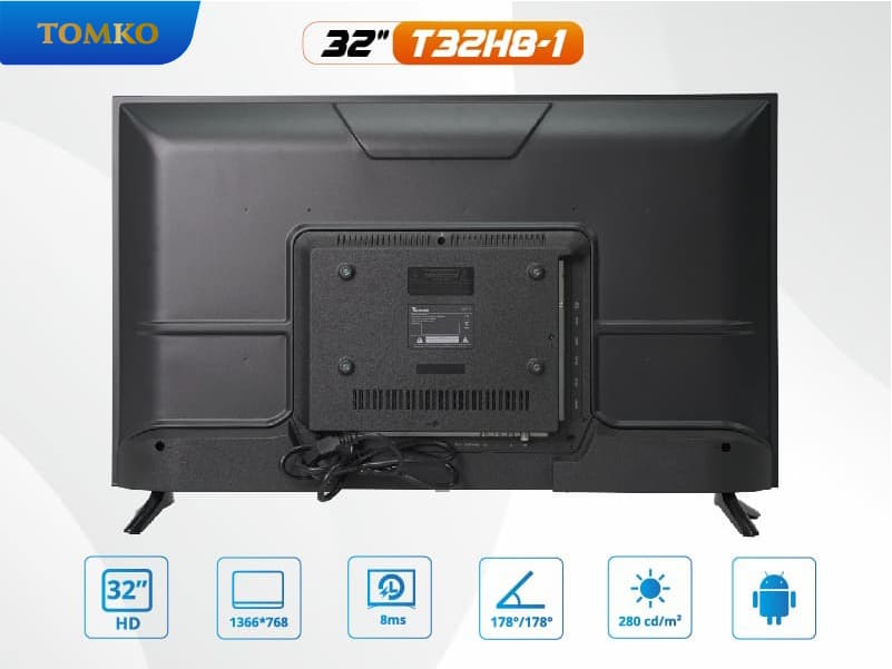• Smart Tivi Tomko 32 inch có độ phân giải HD (1366 x 768px) với tần số quét 60Hz.