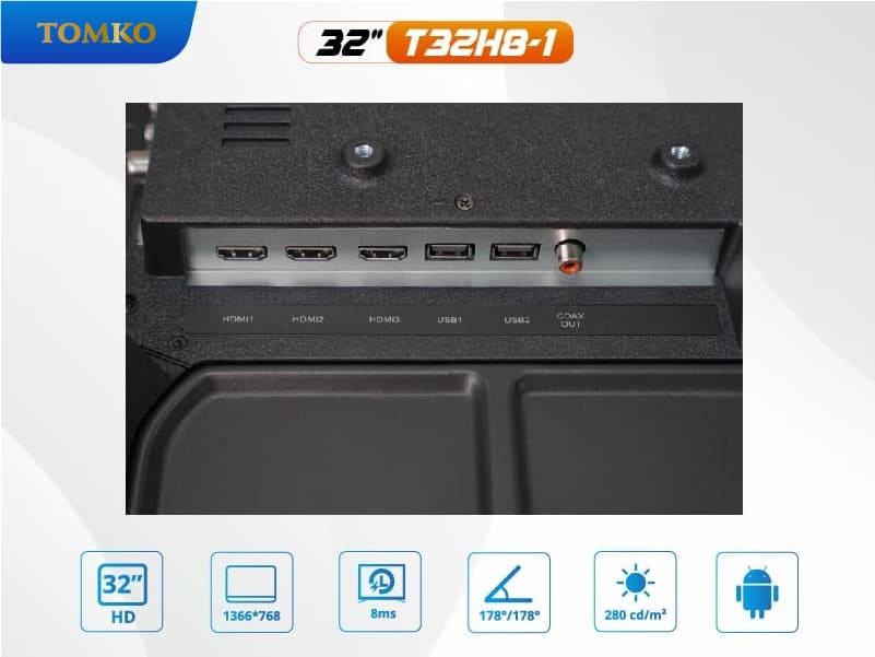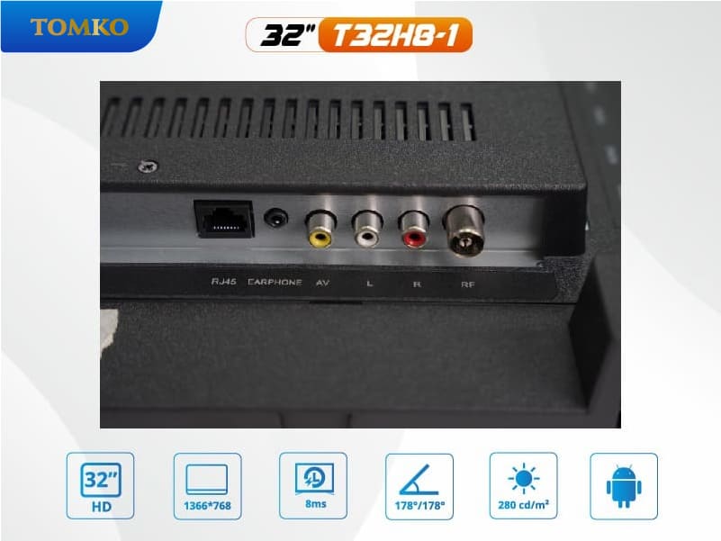 Tivi Tomko 32inch được trang bị đa cổng kết nối, cho phép người dùng dễ dàng kết nối đa thiết bị và tận hưởng trải nghiệm giải trí đa dạng: HDMI, VGA, AV, ATV, YPBPR, USB, Earphone, RJ45, COAX Out, CVBS/AUDIO IN, RF Tuner.
